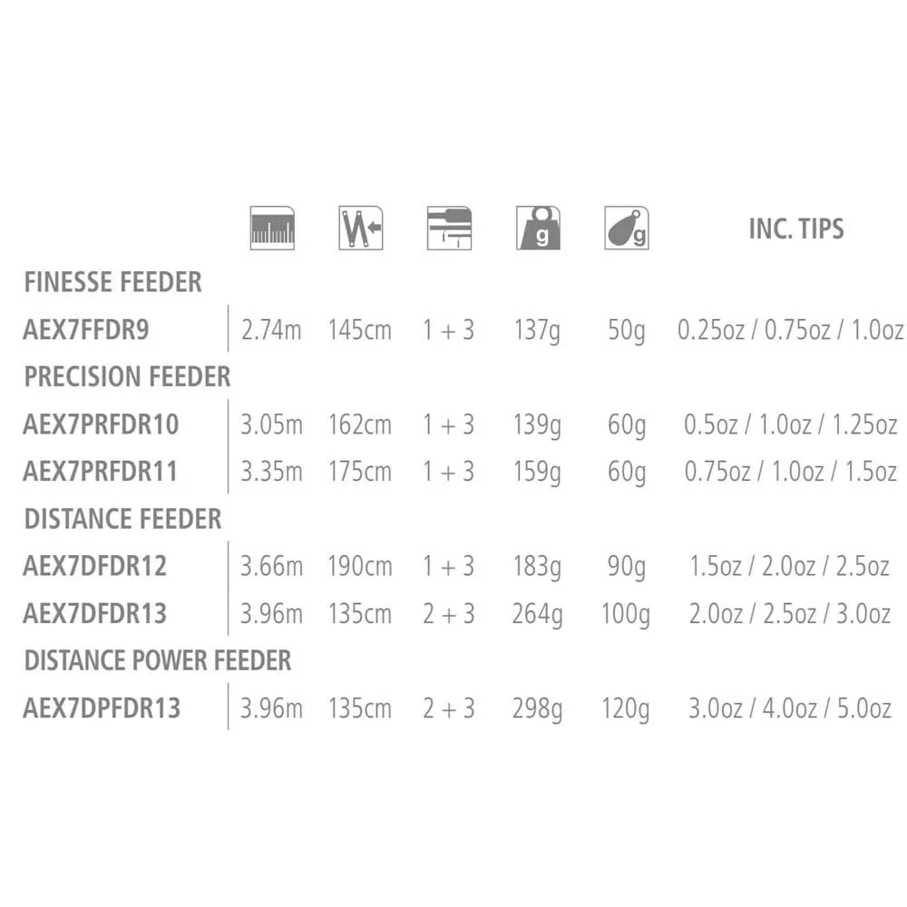 The AERO x7 range is a completely newly developed range of rods for coarse/match angling. Every rod in this range has been tested over and over again by a team of pro-staff and product developers in order to get the perfect blank actions, balance, responsiveness, strength, guide setting and quiver tip actions. This resulted in the ultimate feeder rods series for competition anglers who are demanding only the very best of their material. The rods have been developed until perfection and contain some very unique features which will make the difference for the angler.