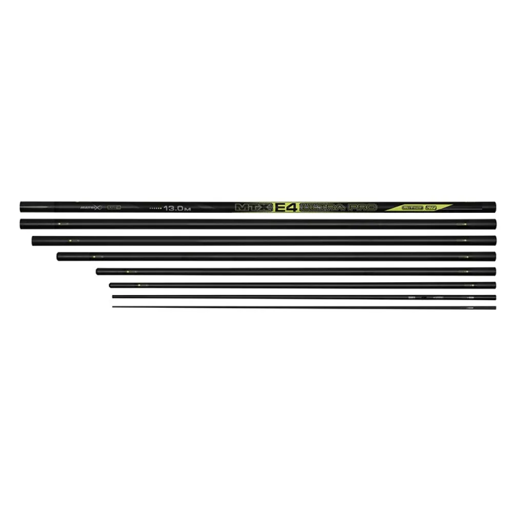 Developed to offer unrivalled performance, the 13m E4 Ultra incorporates the perfect balance between strength and rigidity to create poles that can handle the vigour of modern day carpadrome fishing, but still remain ultra-responsive for natural waters and silver fish. Developed using the highest quality Japanese carbon and high impact resin to offer unrivalled strength and rigidity.
